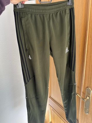 Pantalón deportivo Adidas de color verde. - Diseño con tres rayas negras laterales. - Logo de Adidas en blanco. - Detalle de logo adicional en la pierna izquierda.