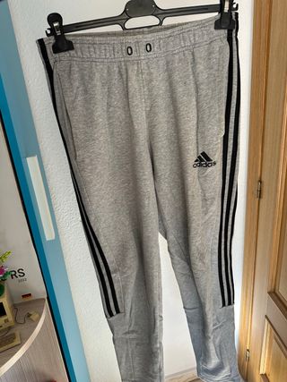 Pantalón deportivo Adidas de color gris. Cuenta con el logo de la marca y las tres franjas características en los laterales. - Logo de Adidas. - Tres franjas laterales.