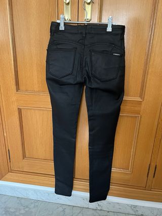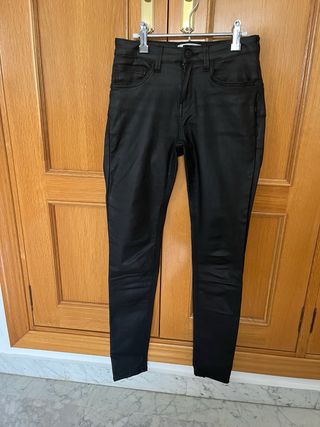 Pantalones Mango encerados, elásticos y pitillo. Color negro, talla 34.