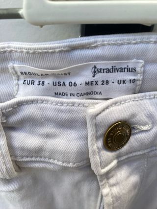 - Diseño de cinco bolsillos. - Cierre de cremallera y botón. - Efecto desgastado. Se venden pantalones modelo D03 de Stradivarius, NO TIENEN NINGÚN USO. Es la talla 42, aunque yo uso 38-40 tallan más bien como una 40. Son tiro medio/bajo. Son tiro recto. Me costaron 25,99. Están nuevos con etiqueta, los vendo porque yo tengo muchas caderas y no me gustan como me quedan, pero son ideales y realzan la figura. .