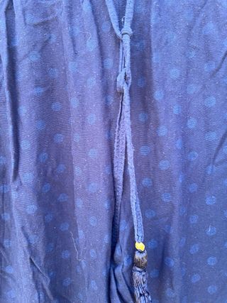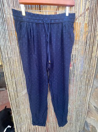 Pantalón largo con un bonito estampado de puntos en tono azul. La cintura es elástica y cuenta con cordón ajustable. Bolsillos laterales. con uso, pero sin defectos. Hago descuentos por lote. Pida medidas sin compromiso.