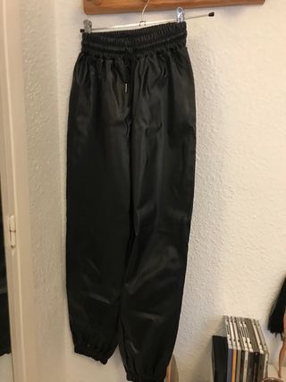 Pantalón de estilo urbano con acabado efecto piel. - Cintura elástica con cordón. - Diseño holgado. Defecto pierna trasera que muestro en la última foto por no lavarlo del revés. Usado un par de ocasiones.