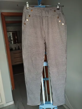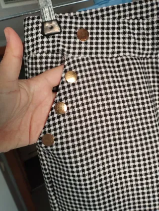 Elegante pantalón elástico de cuadros con un diseño moderno y calentito. Estampado de cuadros blanco y negro. Detalle de botones dorados en los bolsillos. Corte ajustado.