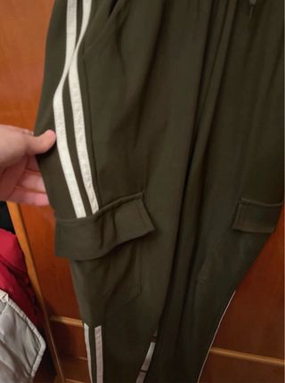 Largo: 105cm Ancho:45cm estira hasta58cm Pantalón deportivo de color verde oscuro con detalles de rayas blancas. - Diseño cargo con bolsillos. - Cintura elástica con cordón. - Rayas laterales deportivas.