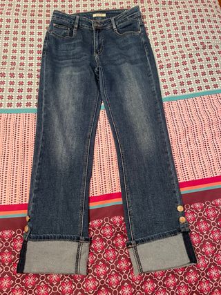 Pantalón vaquero de corte recto con un lavado azul . Presenta un detalle de botones dorados en los bajos y un dobladillo ancho. - Diseño de cinco bolsillos. - Cierre de cremallera y botón. - Costuras reforzadas.