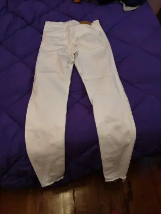 Pantalones vaqueros de color blanco, con un diseño moderno y un acabado deshilachado en los bajos. - Corte recto. - Cintura con trabillas para cinturón. - Cierre de cremallera y botón. - Bolsillos delanteros y traseros. - Bajo deshilachado.