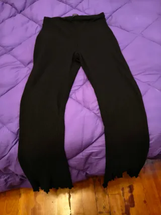 Pantalón negro de tejido acanalado con un diseño moderno. - Cintura elástica. - Piernas acampanadas. - Bajo con acabado festoneado.