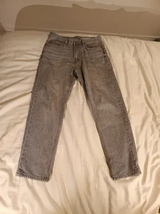 Pantalón vaquero de corte recto, ideal para un estilo casual. - Color grisáceo con efecto desgastado. - Cierre de cremallera y botón. - Bolsillos delanteros y traseros.