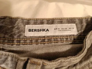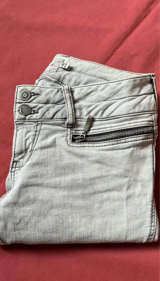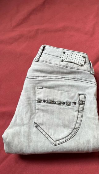 Pantalones vaqueros de color gris marca Bershka Talla 36 98% algodón, 2% elastano Largo: 96,5 cm Cintura: 37 cm - Detalle de tachuelas en los bolsillos. - Parche decorativo en la parte trasera - Pitillo con cremallera en los bajos para abrir/cerrar