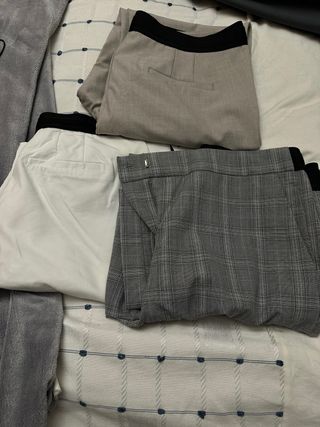 Pantalones de vestir de Zara. - Pantalón de color gris con estampado de cuadros. - Pantalón de color blanco liso. - Pantalón de color beige liso.
