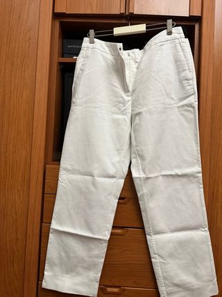 Pantalón de corte recto, marca Promod. Talla 36. Ideal para el verano. Presenta un diseño clásico y versátil. Cierre de botón y cremallera. Bolsillos delanteros y traseros. Trabillas para cinturón. Color beige. Buen estado.