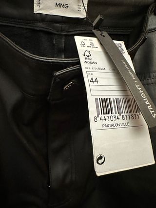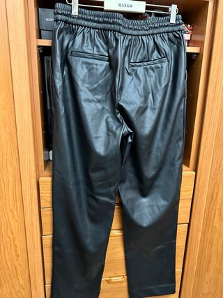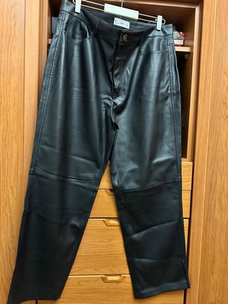 Pantalón efecto piel marca Sfera Sin estrenar. Nuevo con etiquetas Color: Negro Talla: S Tejido base: 100%poliester Recubrimiento: 100%poliuretano Muy suave al tacto Corte recto. Costuras marcadas. Bolsillos delanteros.