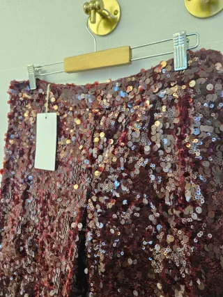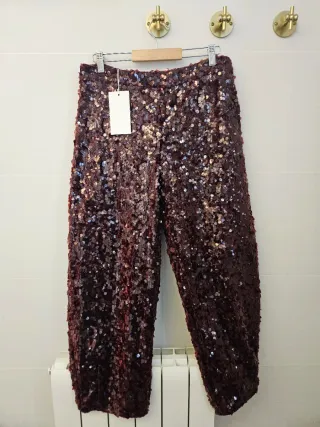 Pantalón de fiesta granate burgundy vino rojo oscuro de Zara. Corte balloon Lentejuelas y tela en terciopelo.