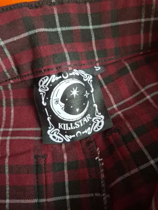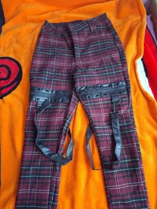 Pantalones de la marca Killstar con un diseño a cuadros en tonos burdeos y negro. Cuentan con detalles de cremalleras y tiras de cuero sintético. - Diseño a cuadros - Cremalleras decorativas - Tiras de cuero sintético