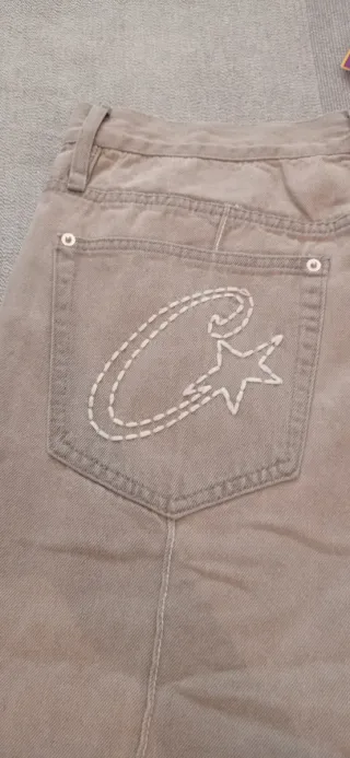 Pantalón vaquero de la marca Cortaiz en color gris. Presenta un diseño con el logo de la marca bordado en la parte trasera. - Logo bordado en forma de 'C' con una estrella. - Costuras blancas visibles en el bordado.