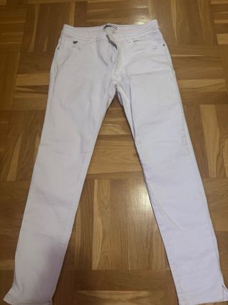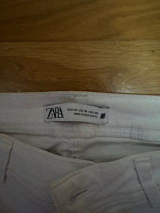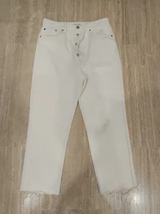 Pantalones vaqueros de color blanco de la marca Pull and Bear. - Talla 32. - Diseño clásico de cinco bolsillos. - Cierre de cremallera y botón. - Tiene la zona del cinto un poco descosido pero se puede coser perfectamente