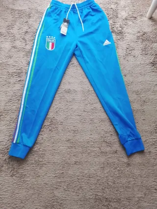 Pantalón de chándal con el escudo de Italia y las icónicas tres rayas de Adidas. - Diseño deportivo y cómodo. - Detalles de las rayas en verde, blanco y rojo a lo largo de las piernas. - Cintura elástica con cordón para un ajuste personalizado.