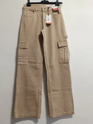 Pantalón cargo de corte recto y color beige, con un diseño moderno y funcional. pantalón cargo de pierna ancha (wide leg) de color beige. - Bolsillos cargo laterales. - Cierre de cremallera y botón. - Trabillas para cinturón. Mide 105 cm de largo, ancho de pata en el bajo 23 cm y 36 de cintura 100% algodón
