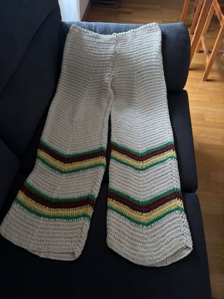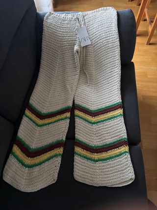 Pantalón de Zara de estilo veraniego y corte ancho. - Tejido de crochet. - Diseño de rayas en zigzag. - Cintura con cordón. - Bajo acampanado.