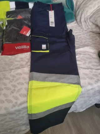 Pantalones de trabajo de la marca Velilla, con detalles en color verde y gris. - Diseño con bolsillos cargo. - Bandas reflectantes para mayor visibilidad. Tengo dos,uno 2xl y uno 3xl ,los dos por 25€