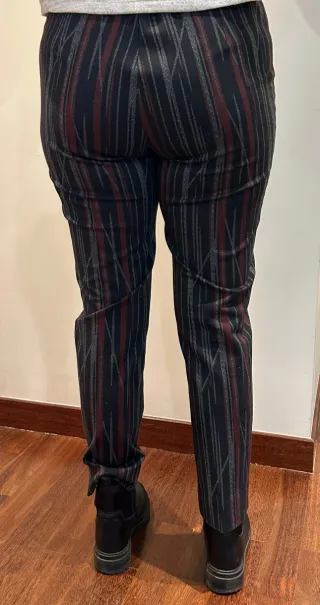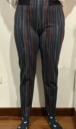 Pantalones elásticos con un diseño de rayas verticales en tonos negros, rojos y grises. - Tejido elástico para mayor comodidad. - Estampado lineal distintivo.