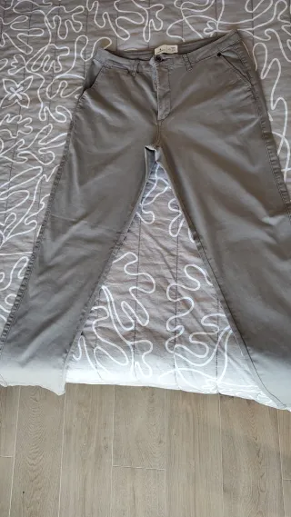 Pantalón chino de corte clásico en color verde oliva o caqui. Sin estrenar - Bolsillos delanteros. - Bolsillos traseros. - Cierre de botón y cremallera.