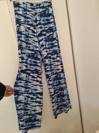 Conjunto de tres pantalones anchos de color azul. Son de talla única y tienen un diseño moderno. - Tejido texturizado. - Cintura con lazo. - Piernas anchas y fluidas.