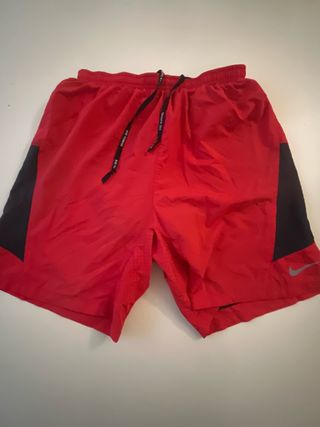 Pantalón corto deportivo Nike para running. - Color rojo con detalles en negro. - Cintura elástica con cordón. - Logo de Nike en la pierna. - Con mallas