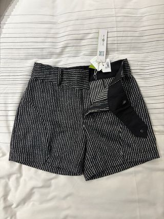 Pantalón corto con un diseño de rayas onduladas en blanco y negro. - Diseño de rayas onduladas. - Cierre con botones.