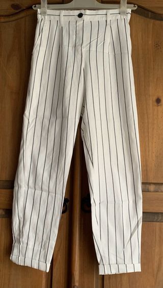 Pantalón de vestir para mujer con un diseño de rayas verticales. Es una prenda cómoda y versátil. - Diseño de rayas finas en contraste. - Cintura con trabillas para cinturón. - Cierre de botón y cremallera.