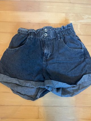 Pantalones vaqueros cortos de cintura alta para mujer. Tienen un diseño moderno y cómodo. - Cintura elástica con detalle fruncido. - Cierre de cremallera y dos botones. - Bolsillos delanteros. - Dobladillo en los bajos.