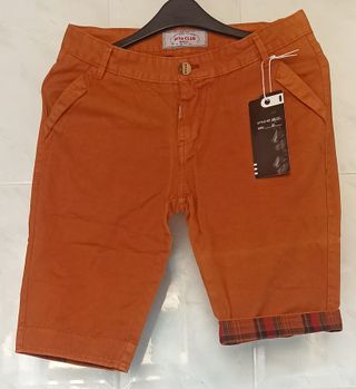 Pantalón corto de estilo vaquero con un diseño moderno y versátil. - Color naranja vibrante. - Detalle de remate interior reversible con estampado de cuadros. - Cinturón a juego.