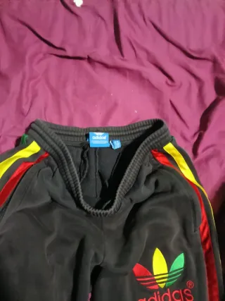 Pantalón deportivo Adidas con un diseño llamativo. - Color principal negro. - Tiras laterales en rojo, amarillo y verde. - Logo de Adidas en la pierna.