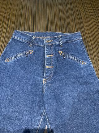 Pantalon vaquero largo, con bolsillos a los lados con cremallera, y tres botones
