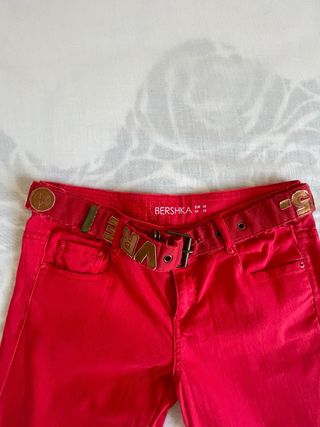 Pantalón vaquero recto de color rojo, con un diseño moderno y juvenil. Incluye un cinturón a juego. - Corte recto. - Detalle de cinturón metálico.