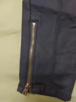 Pantalón de corte ajustado en color azul marino. Presenta detalles de cremalleras decorativas en los bolsillos delanteros y en los bajos. Elástico, parecido al cuero. - Dos bolsillos delanteros con cremallera. - Cremalleras en los tobillos.