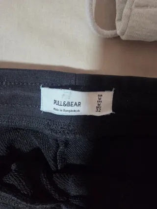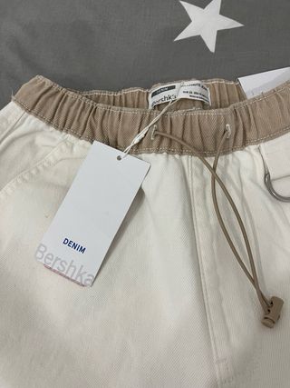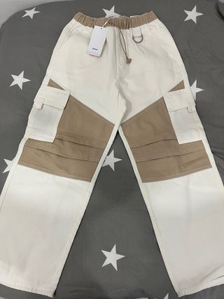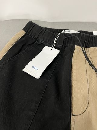 Pantalón a estrenar cargo de Bershka con un diseño moderno y llamativo. -De la sección de hombre. - Diseño color block con paneles en beige, negro y gris. - Cintura elástica con cordón ajustable. - Bolsillos cargo laterales. - Corte recto.