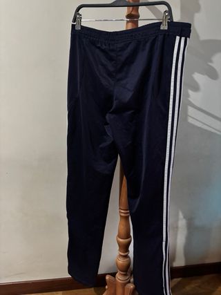 Pantalón deportivo azul de Adidas, con el escudo del Real Madrid. - Diseño con tres rayas blancas. - Cremallera en los bolsillos.