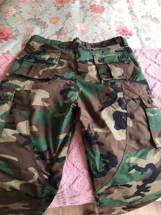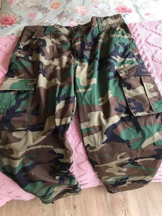 Pantalón de estilo militar con estampado woodland. - Diseño con múltiples bolsillos cargo. - Cierre de botones. - Cintura con trabillas para cinturón - Cintura y bajo ajustable con cinta.