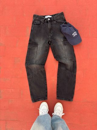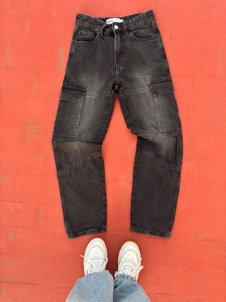 Pantalón vaquero estilo Y2K con corte utility. - Diseño cargo con múltiples bolsillos. - Lavado desgastado en tono negro. - Cintura con trabillas para cinturón.