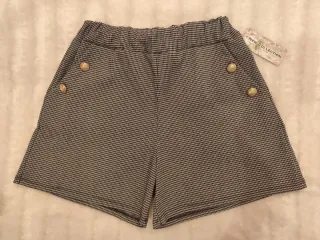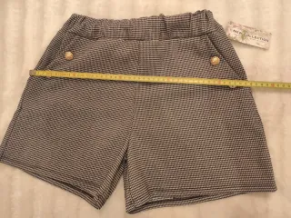 Pantalón corto con un estampado clásico y detalles de botones dorados. -Talla única, aproximadamente 36-38 muy elástico. - Cintura elástica para mayor comodidad. - Diseño de pata de gallo en negro y blanco. - Dos botones decorativos en la parte delantera. -Bolsillos delanteros
