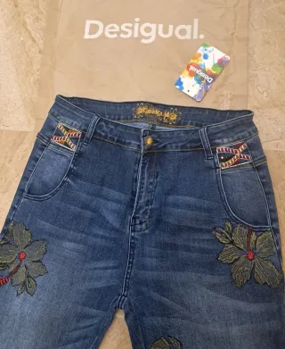 Pantalón vaquero estilo boyfriend de la marca Desigual. Presenta un diseño moderno con detalles bordados. - Corte boyfriend. - Bordados florales en la parte delantera. - Bolsillos traseros con detalle de etiqueta. - Cierre de cremallera y botón. Con etiqueta 🏷 original.