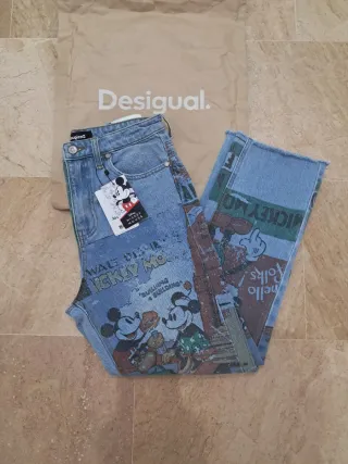 Pantalón vaquero con estampado de Mickey Mouse de Desigual. Nuevo con etiqueta 🏷 - Diseño con múltiples imágenes de Mickey Mouse y elementos de Walt Disney. - Estilo patchwork con diferentes paneles de tela. - Acabado deshilachado en los bajos.