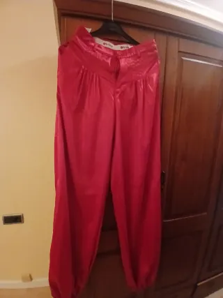 Pantalón de estilo marroquí en color rojo. - Diseño con cintura alta. - Piernas amplias y ajustadas en el tobillo. - Tejido satinado con brillo.