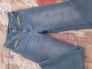 Pantalón vaquero azul con cadena dorada