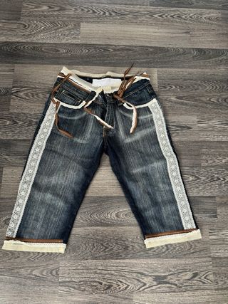 Pantalones pirata de la marca L.M. Lulú con un diseño único. - Detalle de encaje blanco en los laterales. - Ribete de encaje y tejido beige en los bajos. - Cordones marrones para ajustar la cintura.