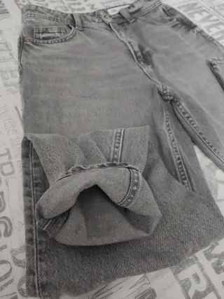 Pantalones vaqueros de corte recto en color gris. Son cómodos. - Cintura alta. - Cierre de cremallera y botón. - Bolsillos delanteros y traseros.