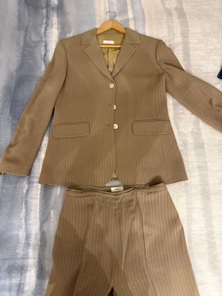 Conjunto de chaqueta y pantalón a rayas verticales. - Chaqueta con solapas y tres botones. - Bolsillos frontales en la chaqueta. - Pantalón de corte recto.