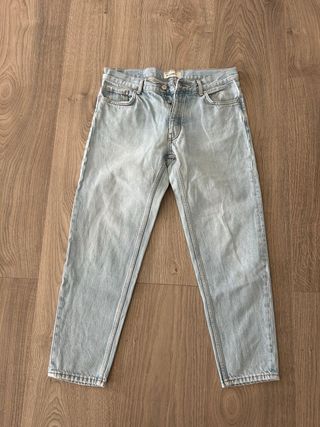 Pantalón vaquero de corte recto en tono azul claro. - Cintura con trabillas para cinturón. - Cierre de cremallera y botón. - Bolsillos delanteros y traseros.