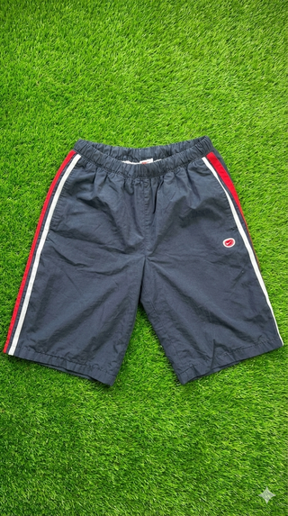 Pantalón corto deportivo Nike original (Vintage). Color gris oscuro con detalles rojos. Talla L. Estilo: Retro con estampado "CTC" detrás. Estado: Usado. Atención: La cintura tiene la tela rota/desgastada (ver fotos). Ideal para: Estar por casa, deporte informal o festivales. 📦 Envío inmediato.